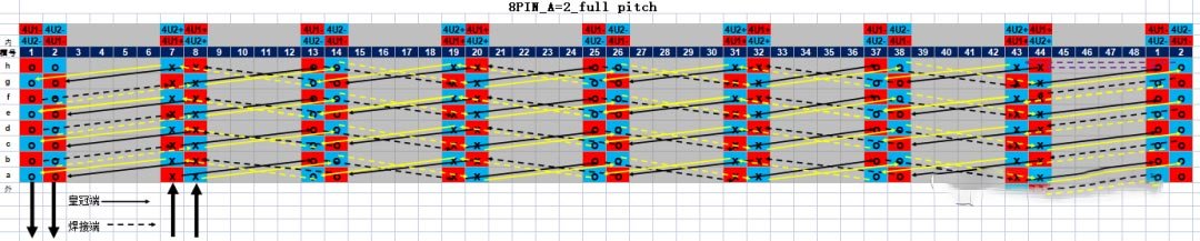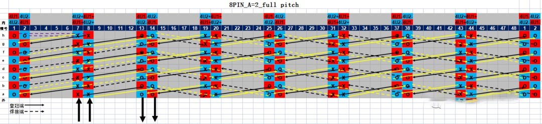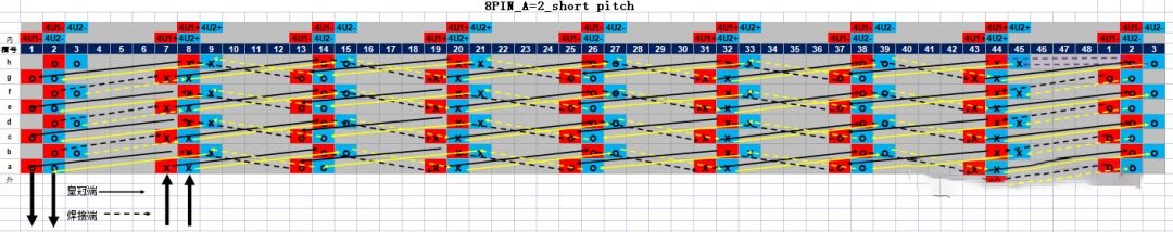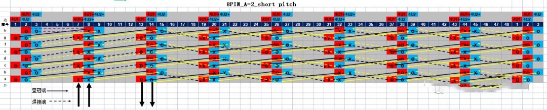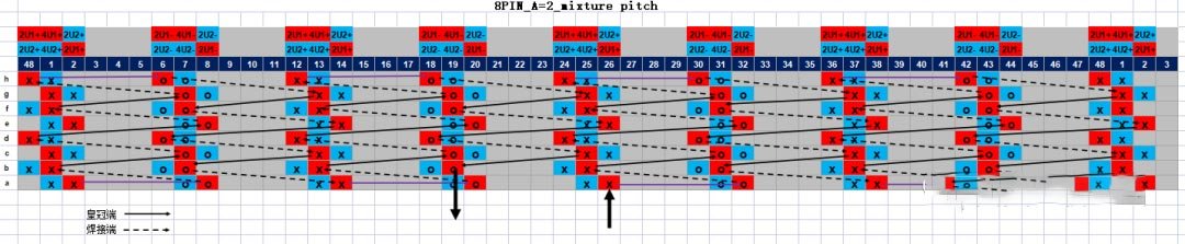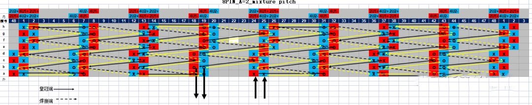 In order to ensure that the ends of the flat wire are neat and beautiful, the lead wires are relatively concentrated, which is more conducive to the arrangement of the busbar. It is usually in the form of wave winding. Due to the limitation of process capacity, the current domestic flat wire motor layers are mainly 4 layers, 6 layers and 8 layers. Take the 8-pole 48-slot 8-layer wave-wound flat wire motor as an example. The number of layers is numbered a-h from the outer diameter to the inner diameter. OX represents the current flow in the slot, red and blue represent two different branches, and the solid line and the dotted line represent the hairpin Crown and soldered ends of windings: