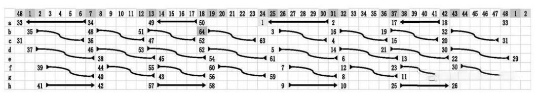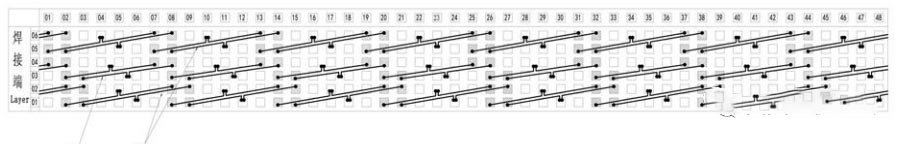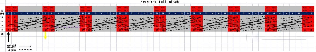 (1) The windings are wound on layers a and b in a wave-like manner along the wire direction according to the pitch Y=6. After the first sub-winding segment (43a-1b) is wound, 1b cannot be connected to 7a because the subsequent layer numbers need to be wound and 7a is already occupied. Therefore, the separation direction of the welding end is changed, and the cross-layer (1b-7c) is connected and continues to be wound. The rest of the sub-winding segments are the same.