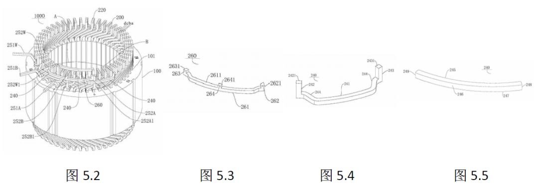(2) As shown in (Fig. 5.2, Fig. 5.3) there are 3 protrusions (262, 263, 264) in the neutral wire (260) of the winding, wherein (262) is welded with the U-phase (252A), and (263) is welded with the U-phase (252A). W-phase (252W) welding, (264) and V-phase (252B) welding.