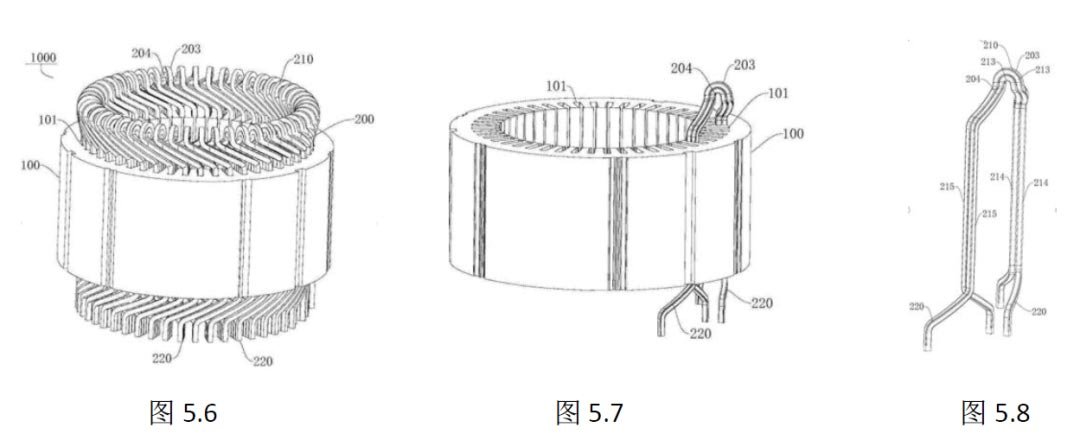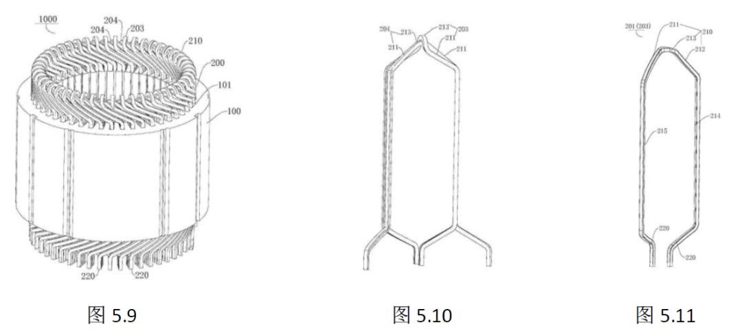 (5) The nose structure can be deformed as follows (Figure 5.9, Figure 5.10, Figure 5.11). The middle connection part (213) of the second type of conductor (204) is changed to a flat head structure, which can reduce the height of the coil.