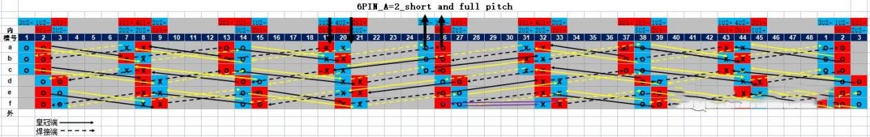 This patent introduces a mixed wave winding scheme of long and short pitch and long full pitch or short full pitch windings. It is characterized in that: the pitch between the two welded ends of the conductors of the Mth layer and the M+1th layer adjacent to the stator core in the radial direction is a short pitch or a long pitch. The pitch between the two welded ends of the conductors of two adjacent layers is a full pitch. Take 8 poles 48 slots 6pin, A=2 as an example, such as (Figure 3.1)