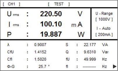 Low power factor Power accuracy range | Apparent power measurement accuracy, ± ( 0.2%×display value)@PF=0 The active power measurement accuracy is based on the above, plus 0.05% of the reading @ PF = 0.001 ~ 0.1 | |