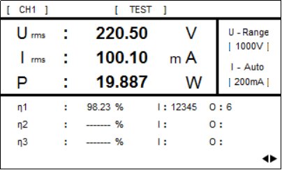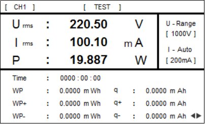 Measurement parameters | Voltage U , current I , active power P , reactive power Q , apparent power S , power factor PF , voltage frequency fU , current frequency fI , phase angle Φ , efficiency η , total electric energy Wh , forward electric energy Wh+ , reverse electric energy Wh- , current integral Ah , 50th harmonic analysis HDF , voltage and current distortion THD , peak voltage Upk , peak current Ipk , voltage peak factor CfU , current peak factor CfI , DC voltage Udc , DC Idc , rectified average value Umn / Imn / Urmn / Irmn , three-phase parameters Σ | |